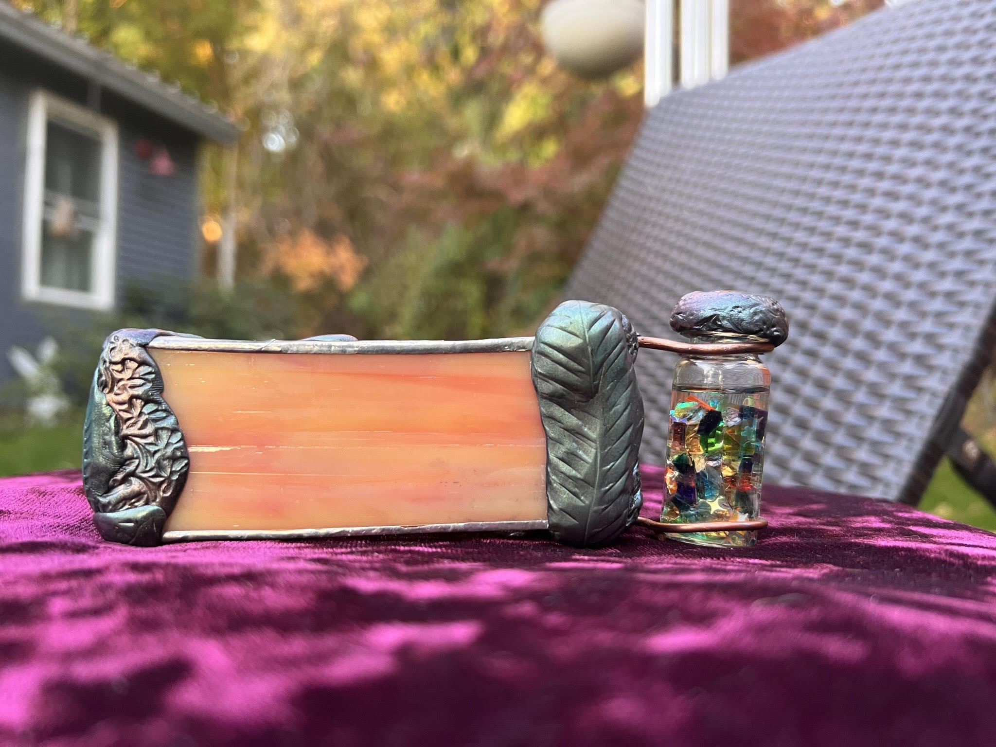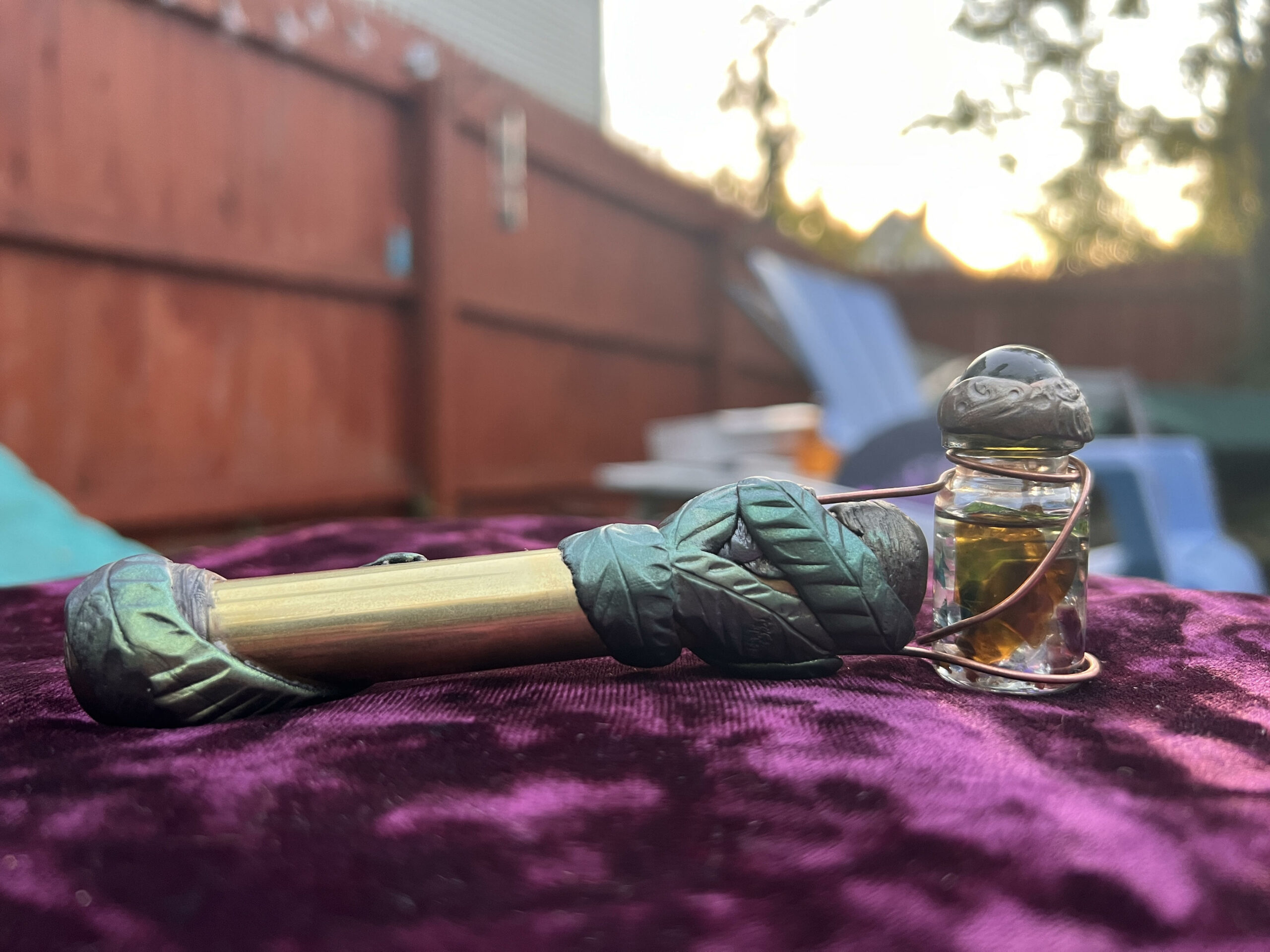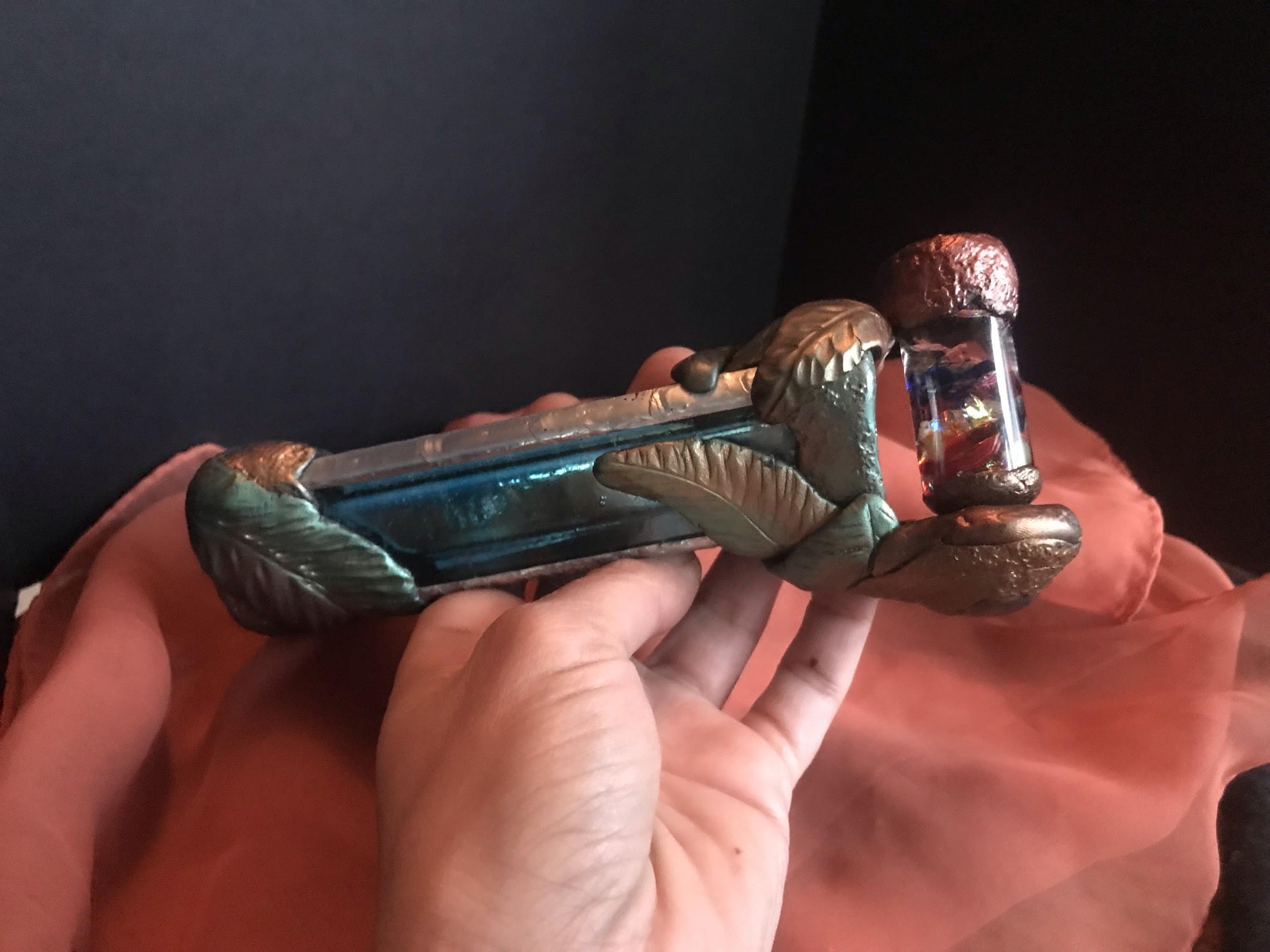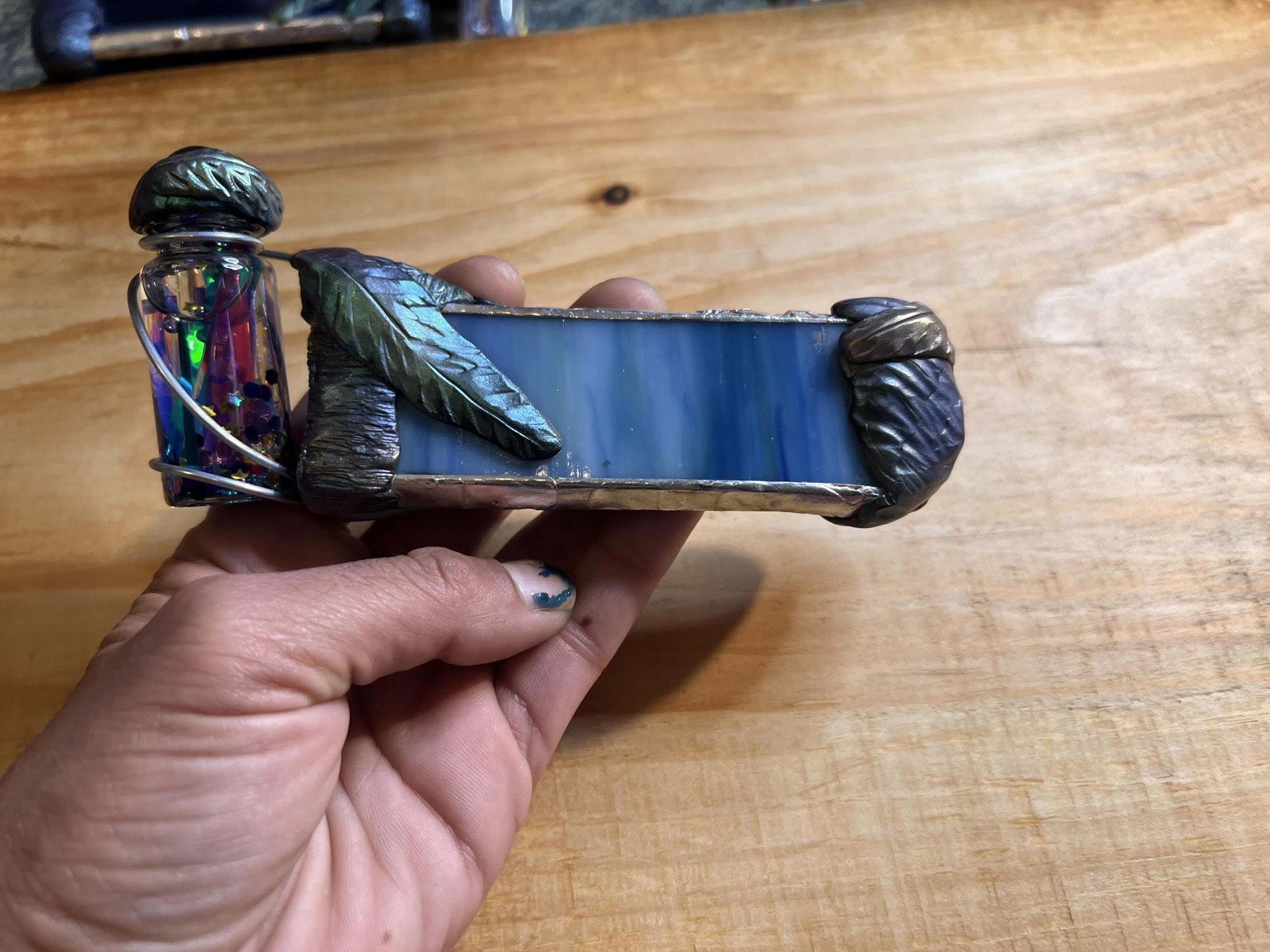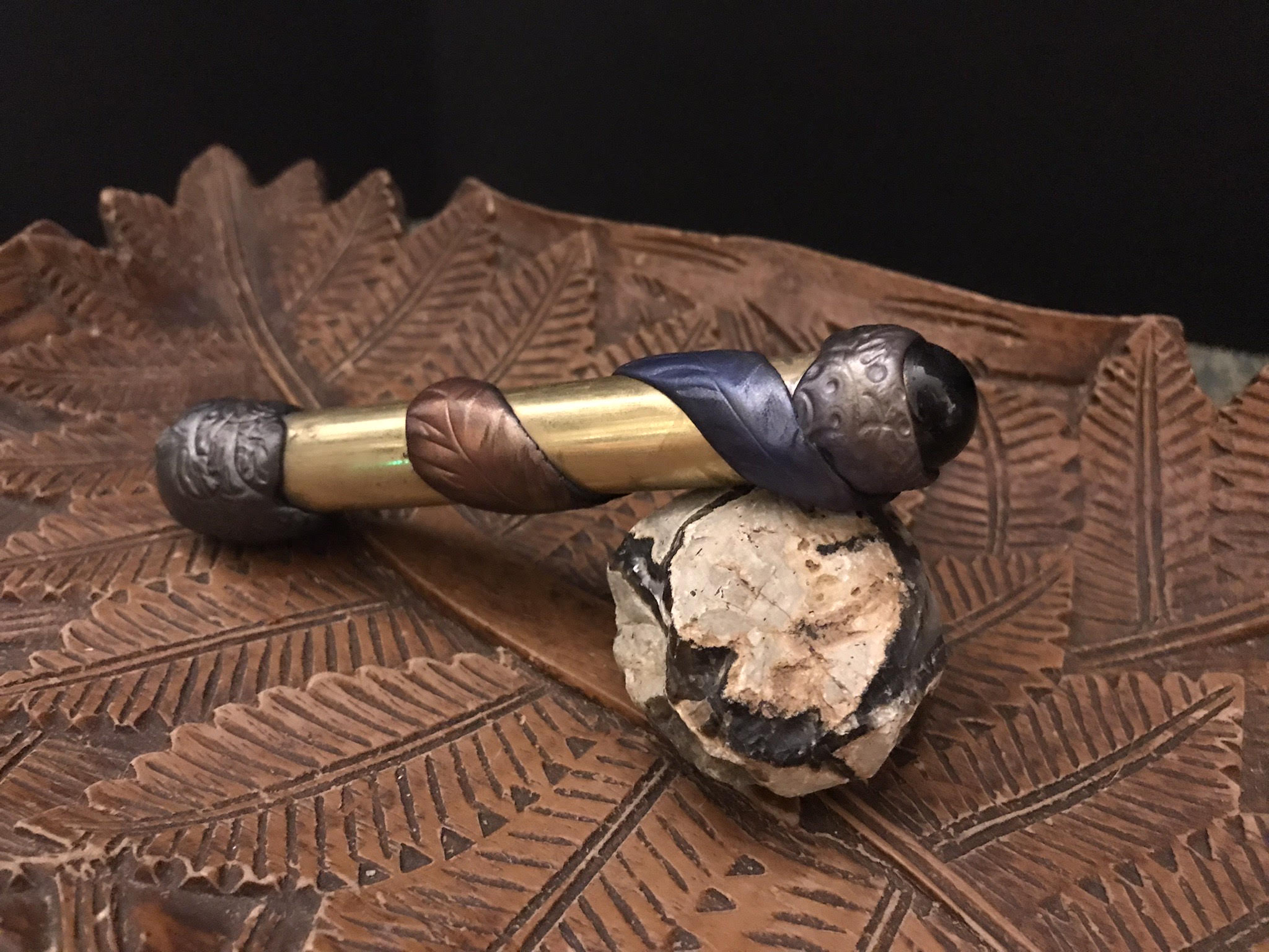 The idea of a clay that could harden without heat was incredibly appealing. Suddenly, any decoration that I wanted to add became fair game. My collection of semi-precious stone beads and unsold handmade jewelry became building blocks that I could use to create a unique style without having to apply heat or flux once the kaleidoscope was sealed. I used leftover mica pigment from my resin crafting days to coat the top of the clay, and used sculpting tools to create leaves and other designs. It has become the most joyful, soothing, and creative part of my building process.