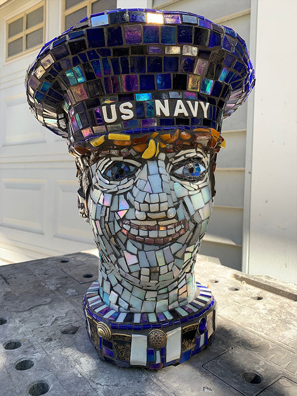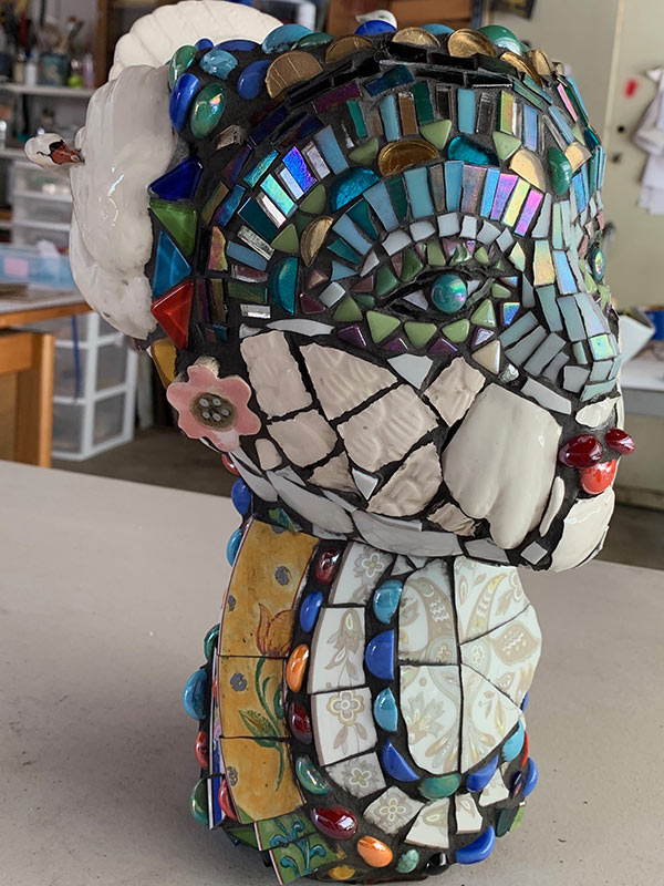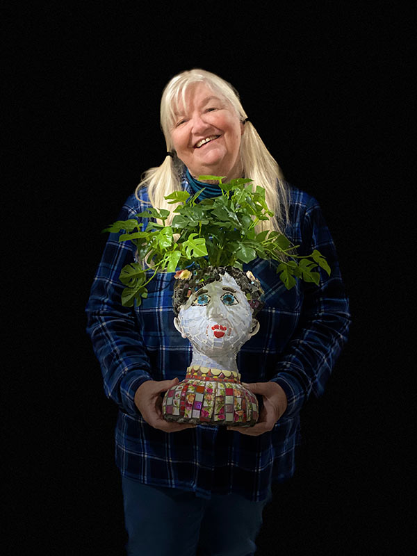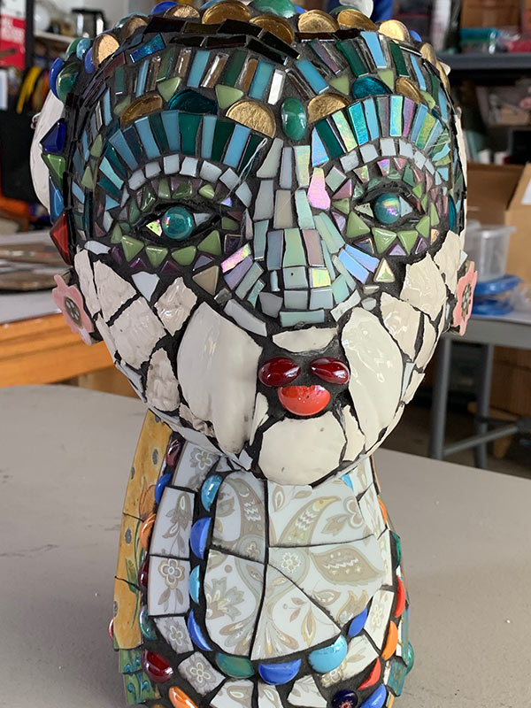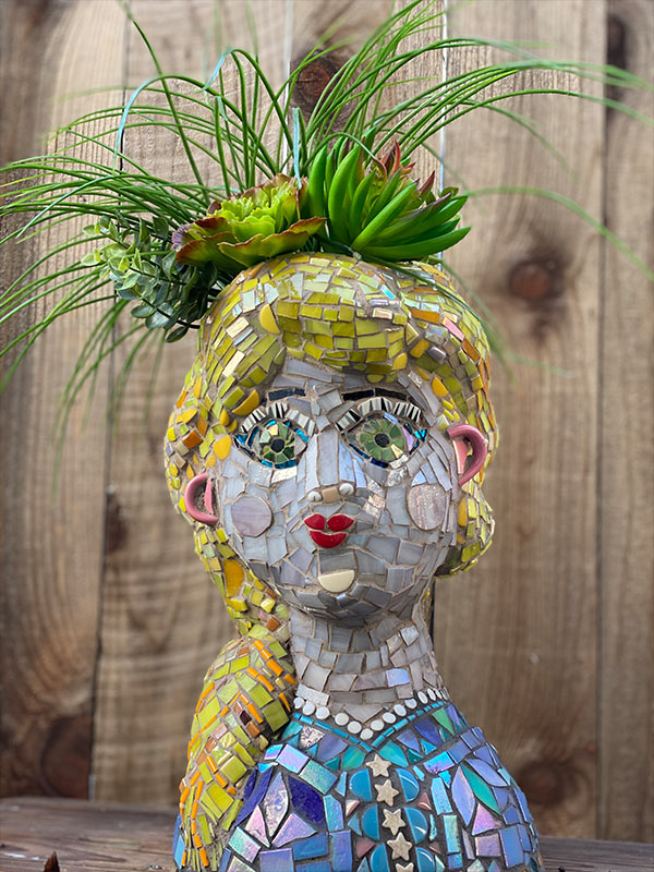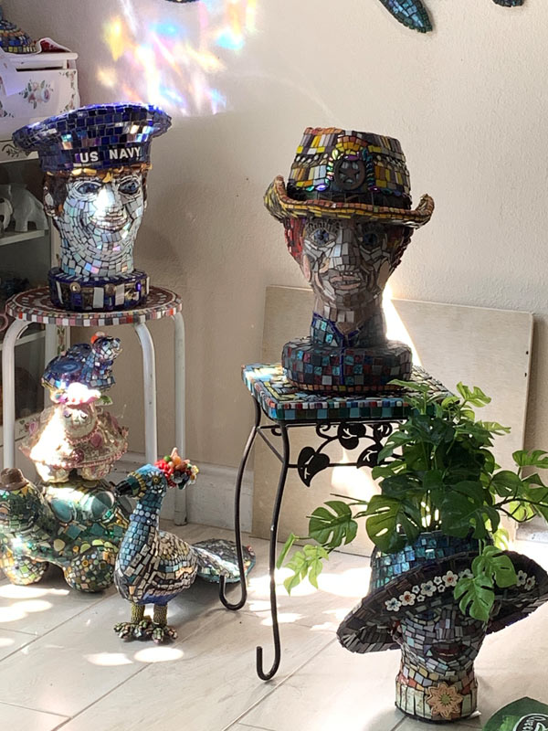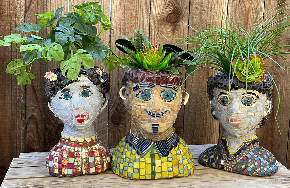Karen has always loved to make and experiment with garden art. A native Californian, she has lived abroad for 10 years in two very different settings: Nicaragua in Central American and the Marshall Islands in Micronesia, teaching English to children and adults, while learning new cultures and languages. Her creative interest took a back seat to being a full-time single mom, and while her two boys grew up back in the States, she earned two degrees in English as a Second/Foreign Language. At San Francisco State she became the Director of New Student Programs and for 25 years helped students and families prepare for degrees, and designed and implemented a successful peer counseling program. While working as an educator, experimenting in the garden was always her happy place. Mixing mediums and working with cement, wood, clay, jewelry, and painting lead her naturally to mosaics. At the point she retired from the university, she was finally able to launch a business and make art full time. She turned her home into a creative space and wakes each day to make more art! She approaches her art from a whimsical lens. It makes her happiest to people react to her pieces with joy and laughter. Currently she teaches her style of mosaics in Modesto, California continuing to find ways to mix it up in mosaics.